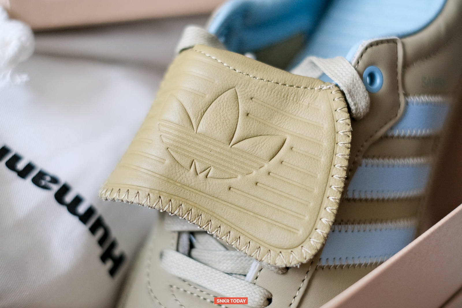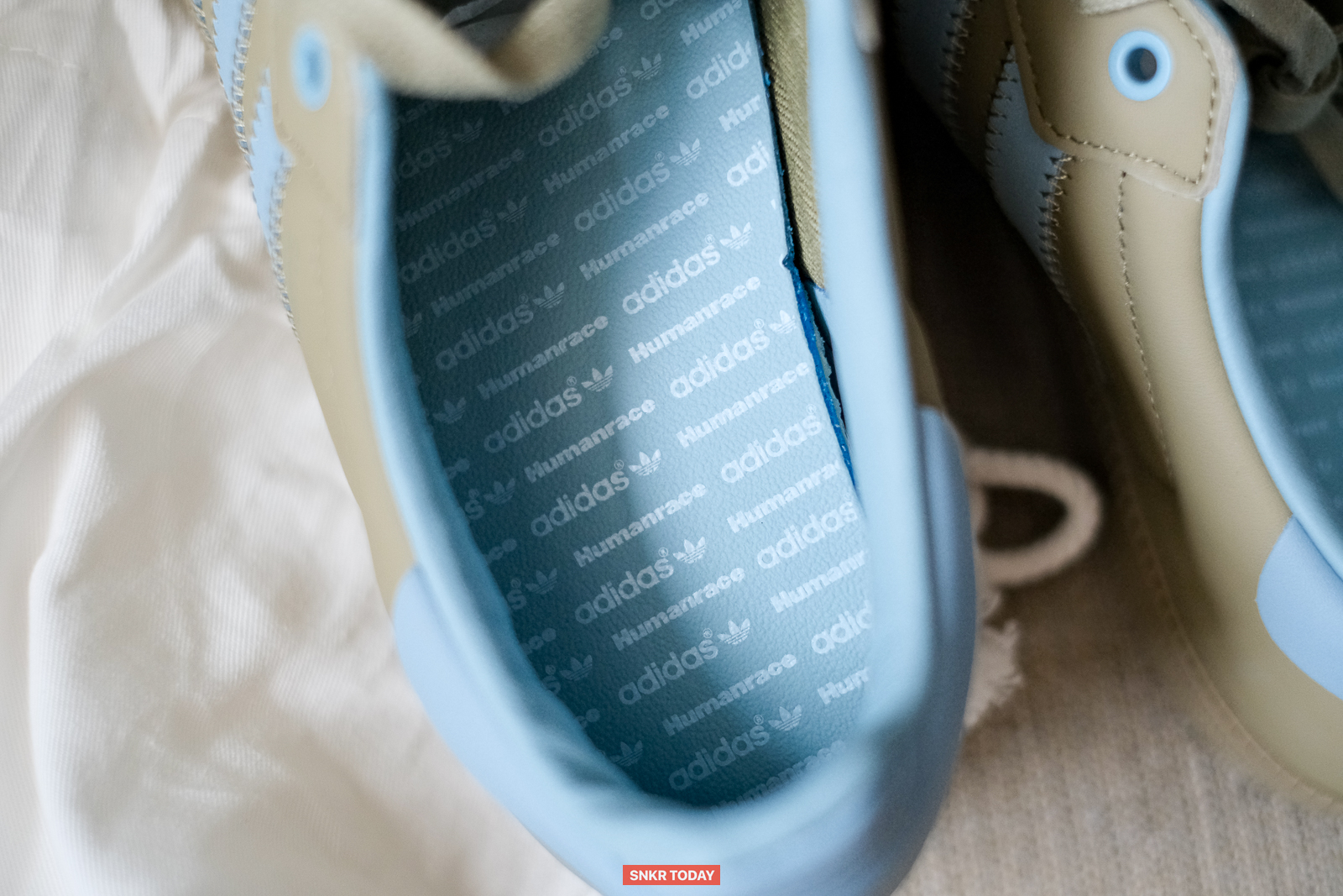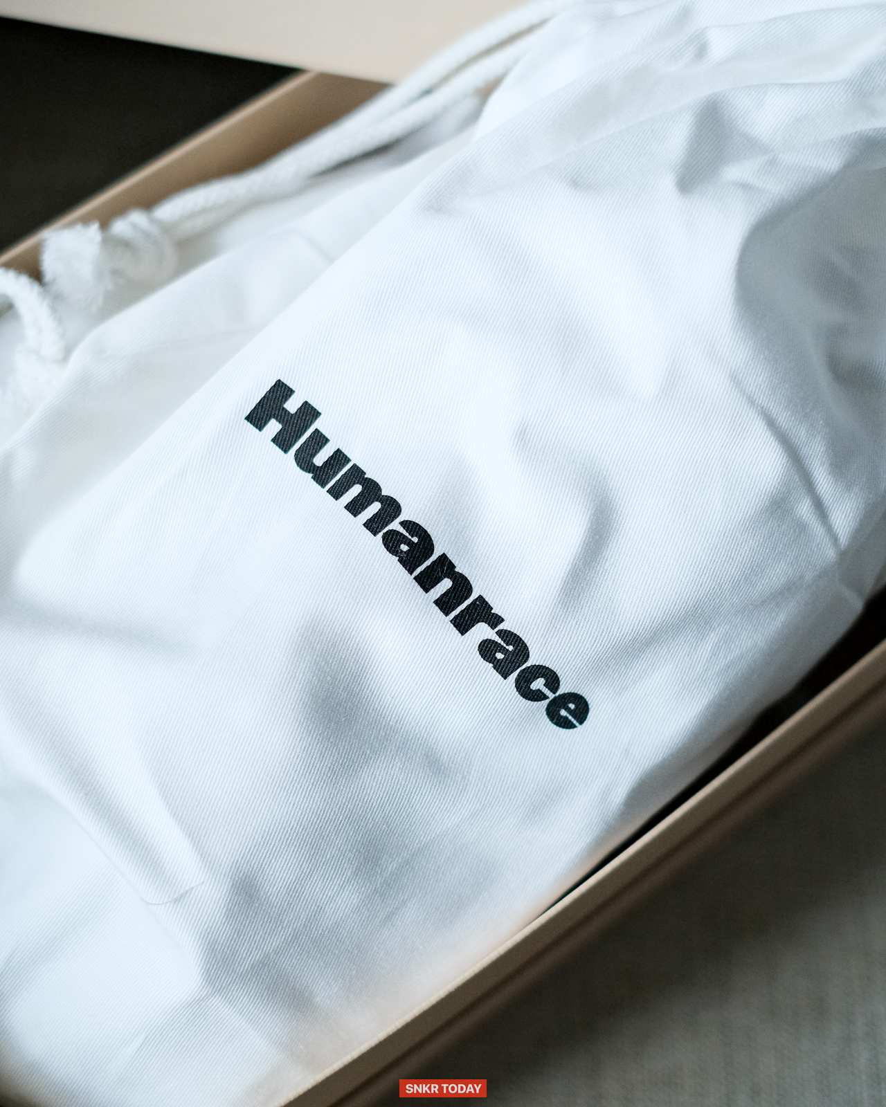 เริ่มจากตัวกล่อง ก็มาในรูปแบบที่แตกต่างจาก adidas Samba ทั่วไป โดยจะเป็นกล่องที่เปิดฝาขึ้นด้านบน และรองเท้าก็ถูกใส่มาถุงผ้าที่สกรีนว่า Humanrace ทั้งสองข้าง และยังมีเชือกสีฟ้าสีเดียวกันแถบ 3 ขีดมาให้เปลี่ยนอีกด้วย