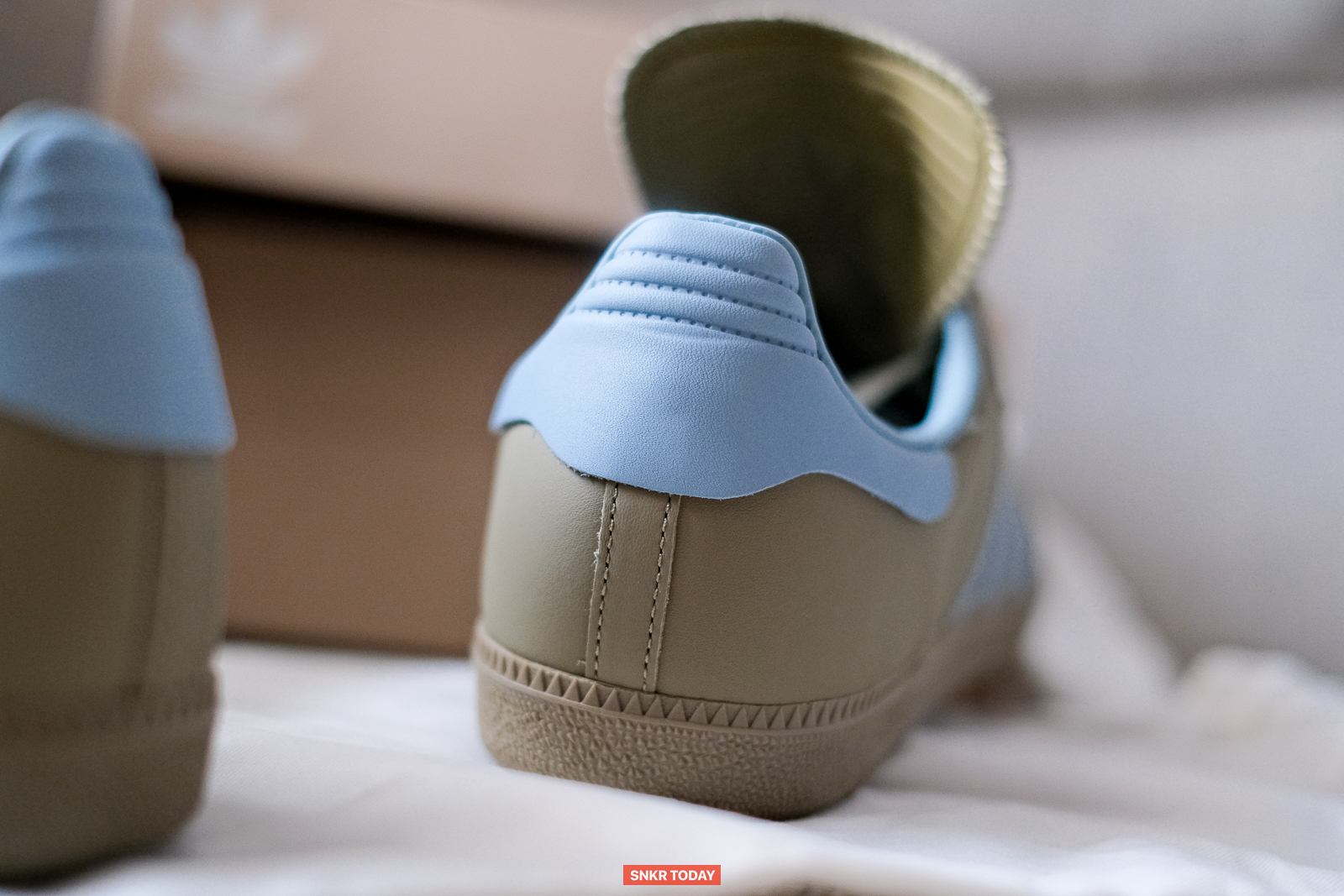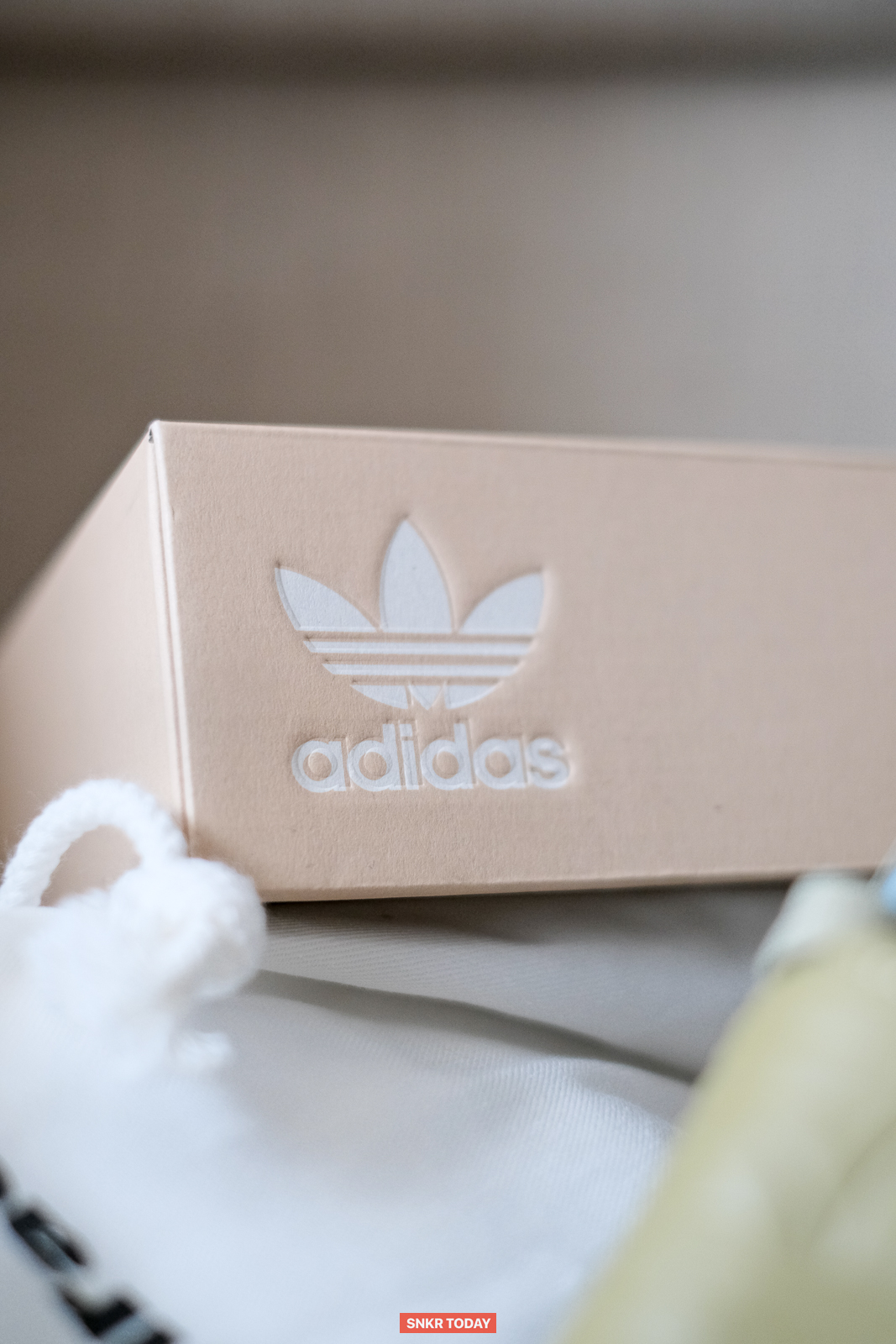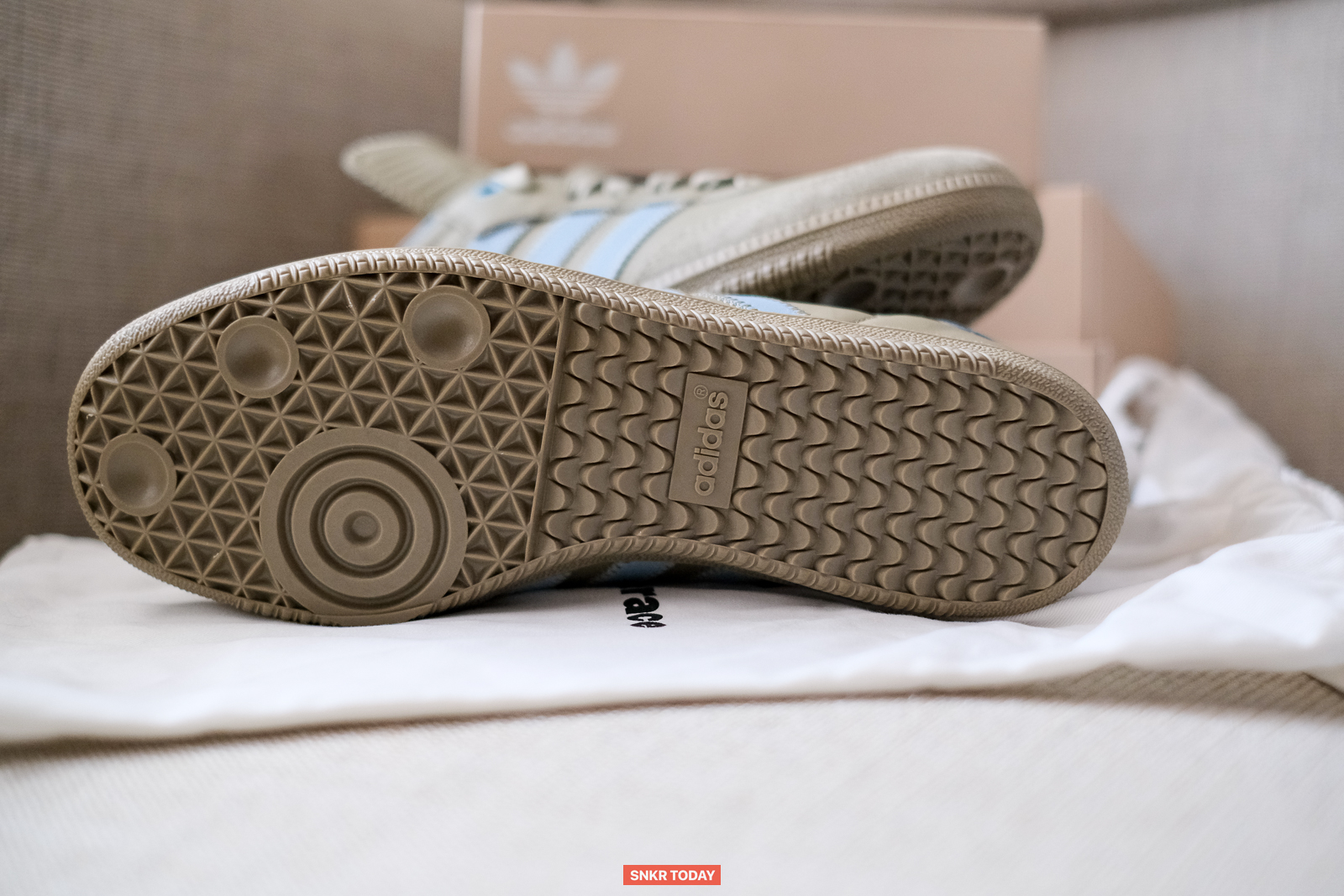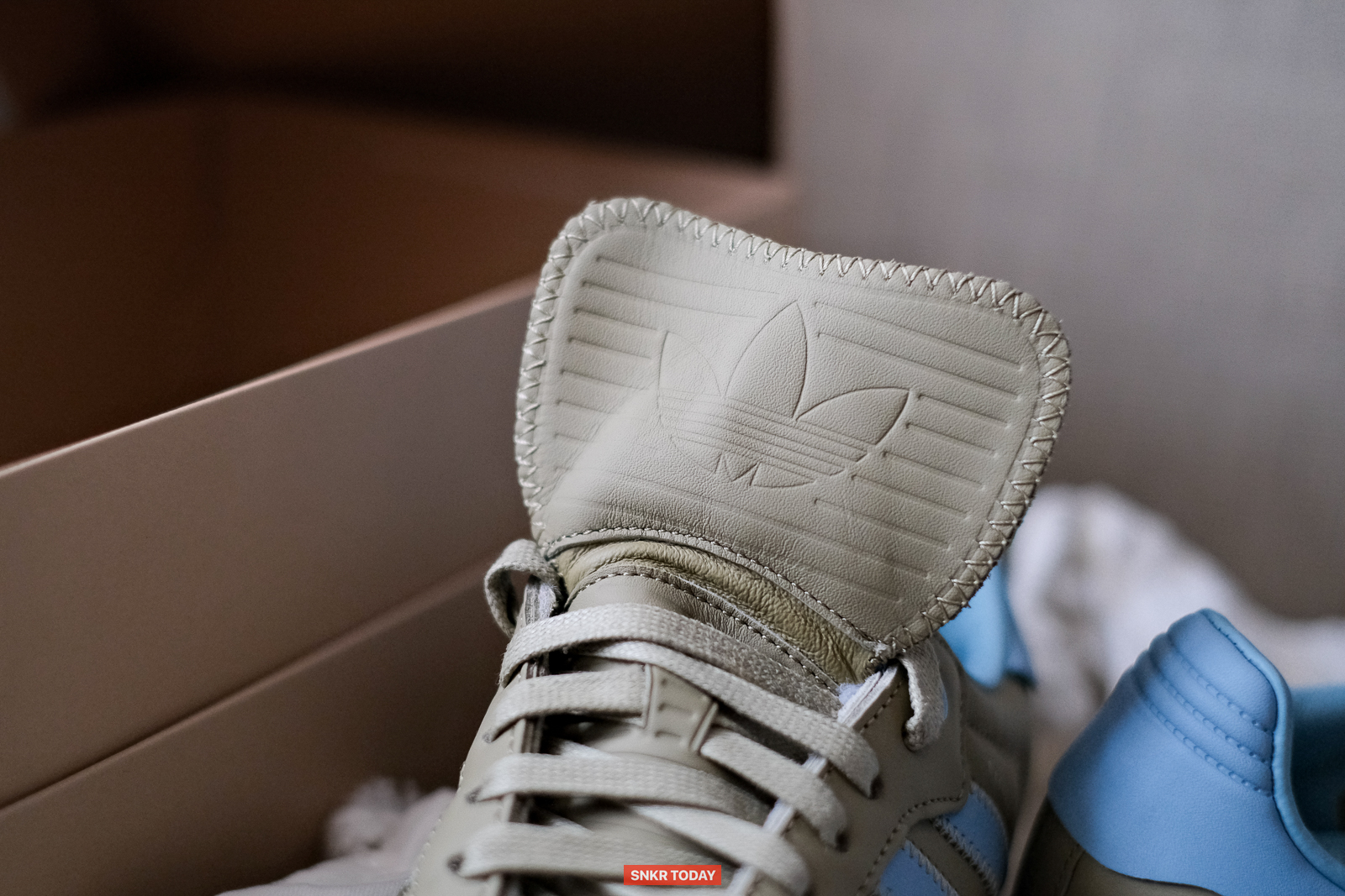 เริ่มจากตัวกล่อง ก็มาในรูปแบบที่แตกต่างจาก adidas Samba ทั่วไป โดยจะเป็นกล่องที่เปิดฝาขึ้นด้านบน และรองเท้าก็ถูกใส่มาถุงผ้าที่สกรีนว่า Humanrace ทั้งสองข้าง และยังมีเชือกสีฟ้าสีเดียวกันแถบ 3 ขีดมาให้เปลี่ยนอีกด้วย