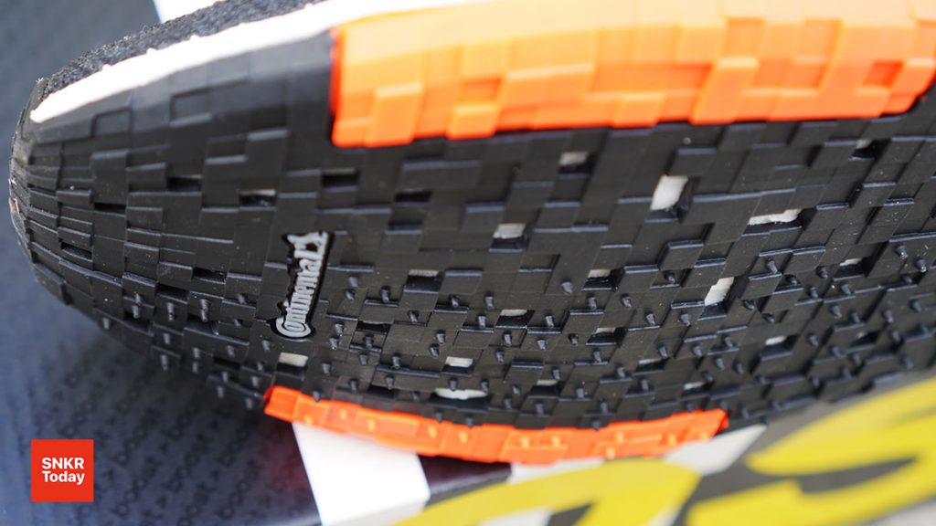 พื้นชั้นนอกเป็นแบบใหม่อีกเช่นเดียวกัน “Continental Adaptive Traxion” ลวดลายที่เห็นนี้เป็นการออกแบบและพัฒนาโดย AI เพื่อให้การยึดเกาะและปรับเปลี่ยนทิศแบบกระทันหันบนพื้นแห้งหรือเปียกได้อย่างมีประสิทธิภาพ จะเห็นได้ว่ามีจุดเล็กๆ ขึ้นมาตามพื้นเพียบเลย น่าสนใจว่าจุดเหล่านี้จะทนทนาแค่ไหนกับการวิ่งพื้นปูน พื้นถนน