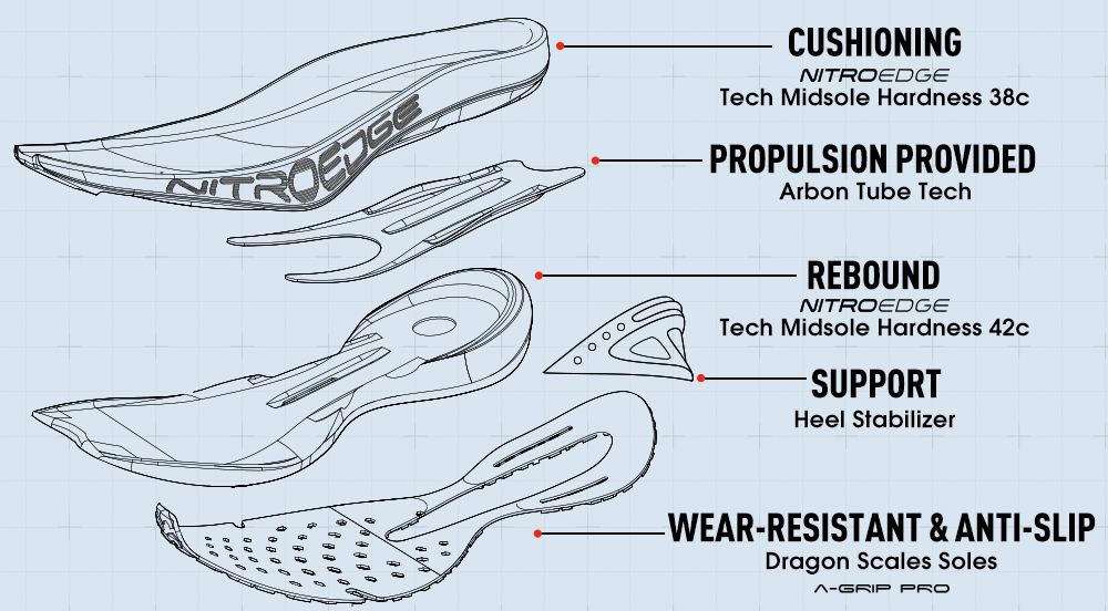 โดยแผ่น Carbon Tube นี้จะช่วยเสริมความมั่นคงและเพิ่มแรงส่งคืนกลับมา และสามารถมองเห็นได้จากด้านล่างของรองเท้า