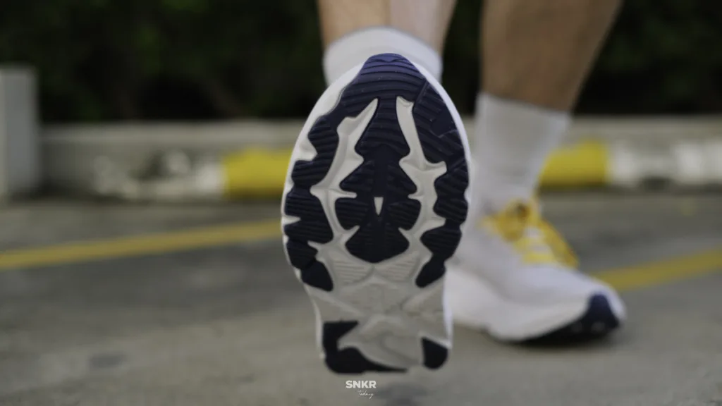 และพื้นชั้นนอกยางที่วางในรูปแบบโซน โดยเน้นช่วงหน้าเท้าและส้นเท้า ตรงกลางจะเป็นโฟมเปลือย และช่วงอุ้งเท้าก็จะเป็นโฟมที่ชิ้นเดียวกับ H-Frame แบบใหม่ที่จะมาคอยพยุงอุ้งเท้า