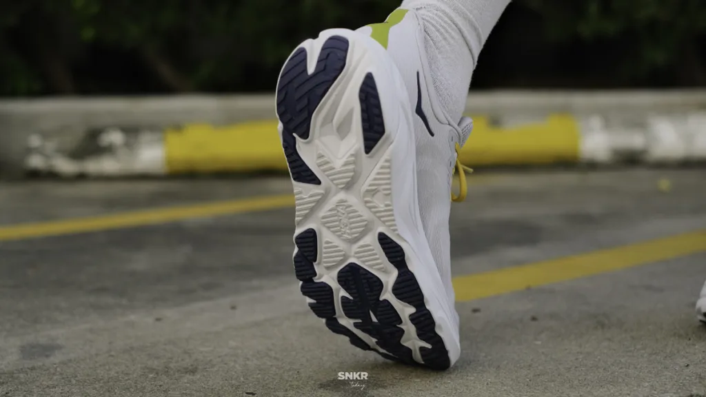 การยึดเกาะยังคงทำได้ดีตามมาตรฐานของ HOKA ตัวยางมีความเหนียวหนับ เวลาเดินบนพื้นกระเบื้องสะอาดๆ ก็มีเสียงเอี๊ยดอ๊าดให้ได้ยินอยู่ จังหวะวิ่งก็ให้การยึดเกาะได้ดี ไม่มีลื่นหรือสะบัด