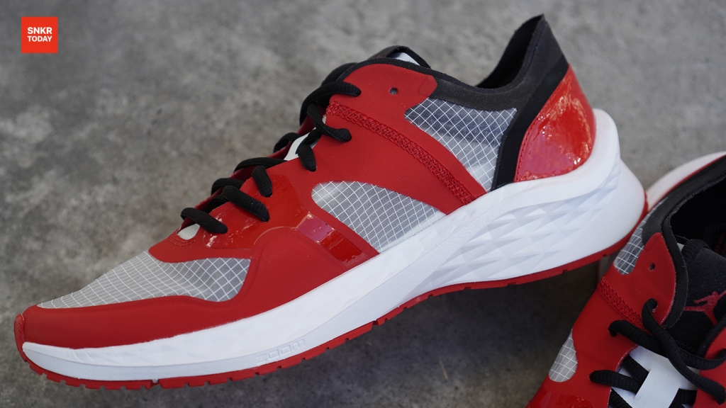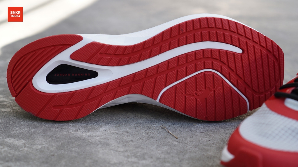 ส่วนพื้นชั้นนอกก็เป็นยางและมีลวดลายเป็นเส้นๆ ตัดแนวขวาง มีโลโก้ Jumpman วางอยู่เช่นกัน และแน่นอนว่ารุ่นนี้ออกมาเพื่อสำหรับการวิ่ง เพราะมีเขียน Jordan Running อยู่ด้านใต้รองเท้า