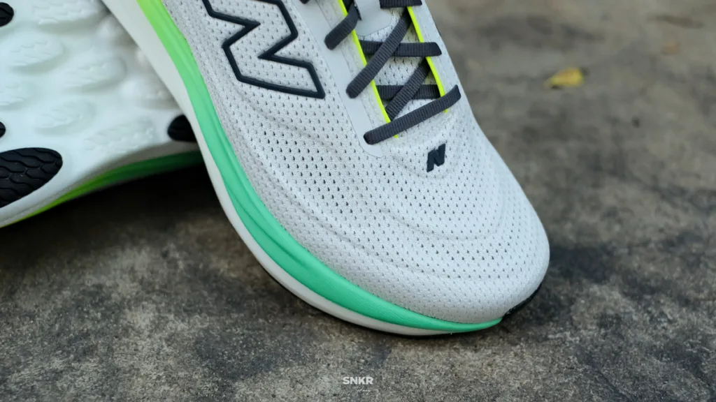 ในรุ่นนี้มีการปรับเปลี่ยนแบบใหม่หมด อัปเปอร์แบบใหม่ ถึงแม้ว่าจะใส่ไซซ์เดิม แต่กลับรู้สึกว่าด้านข้างพอดีกว่าปกติ ถึงแม้ว่ารุ่นนี้ทาง นิว บาลานซ์ ประเทศไทยจะนำรุ่นหน้ากว้าง Wide เข้ามาวางจำหน่ายก็ตาม ส่วนปลายเท้าเหลือปกติ และช่วงเพดาน Toe box ก็สูง ช่วงนิ้วเท้าไม่เจอปัญหาอะไรเลย มีแค่ด้านข้างเท้าที่รู้สึกถูกบีบรัด ลิ้นรองเท้าก็หนานุ่มกำลังสบาย ส้นเท้าแข็งแรง แต่สำหรับเราต้องร้อยเชือกเข้ารันเนอร์ลูปเพื่อให้ข้อเท้ากระชับและพื้นชั้นกลางกระชับเท้ามากขึ้น ทำให้รู้สึกว่าวิ่งได้เพลินขึ้น