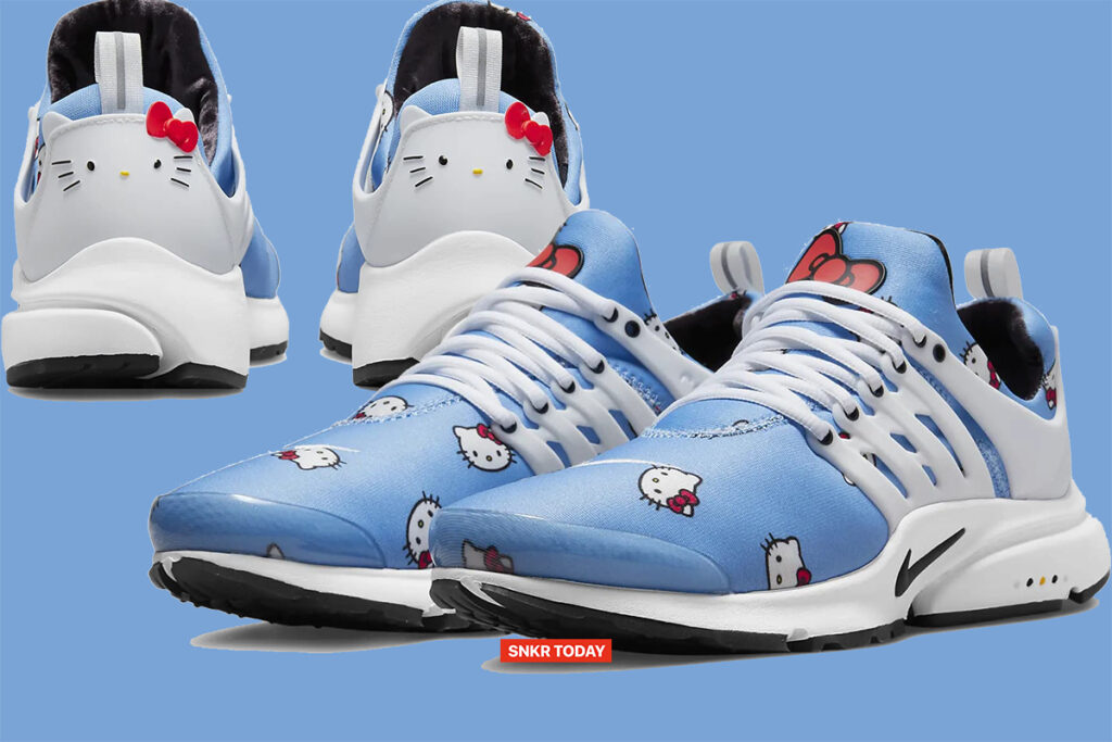 งานนี้แฟนๆ Kitty น่าจะถูกใจไม่น้อยกับการนำคาแรกเตอร์การ์ตูนตัวโปรดสุดน่ารักมาตกแต่งบนรองเท้า Nike Air Presto ซึ่งจะมีการใช้รูปภาพกราฟิกทั่วอัปเปอร์หน้าผ้าสีฟ้า พร้อมกับจัดทำพิเศษกับส้นเท้า Hello Kitty ที่ขึ้นรูปแบบเฉพาะตัวไปจนถึงโบว์สีแดงบนลิ้นรองเท้า ทั้งนี้แผ่นรองด้านในยังมาพร้อมกับลายกราฟิกสีรุ้ง และลายจุด 5 จุดบนพื้นรองเท้าชั้นกลางที่สื่อถึง Nike Alpha Project ที่เป็นต้นกำเนิดของ Air Presto สุดคลาสสิก ทั้งนี้ตัวกล่องยังมีการออกแบบมาใหม่อีกด้วย