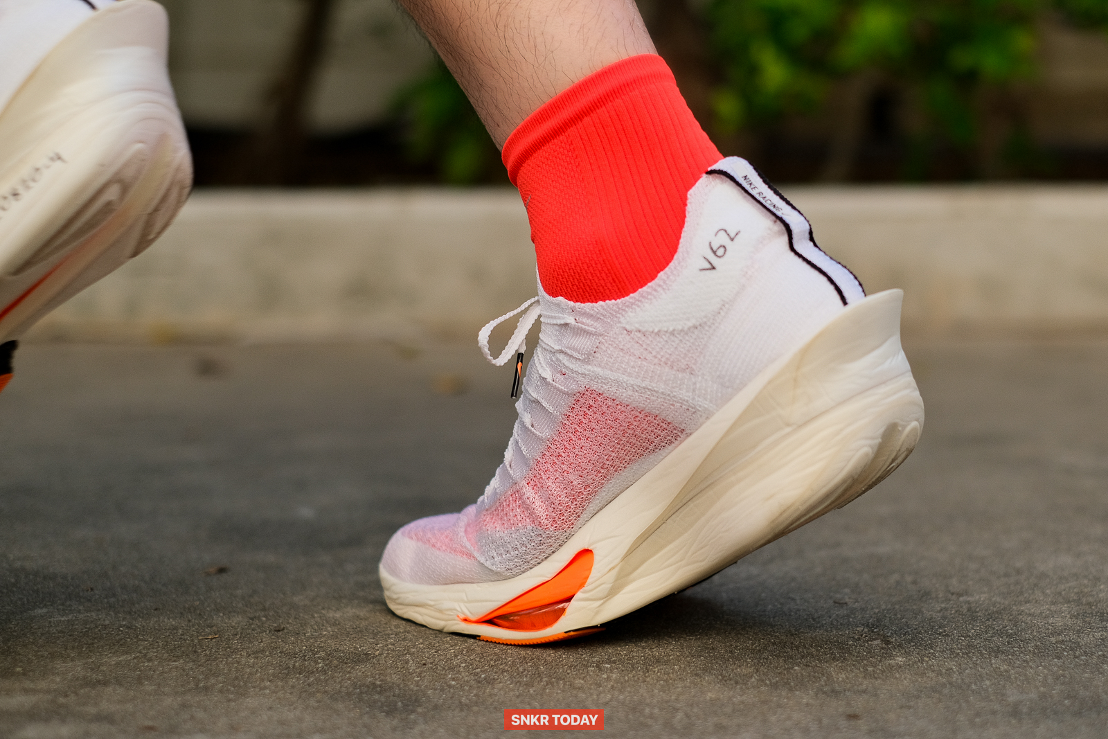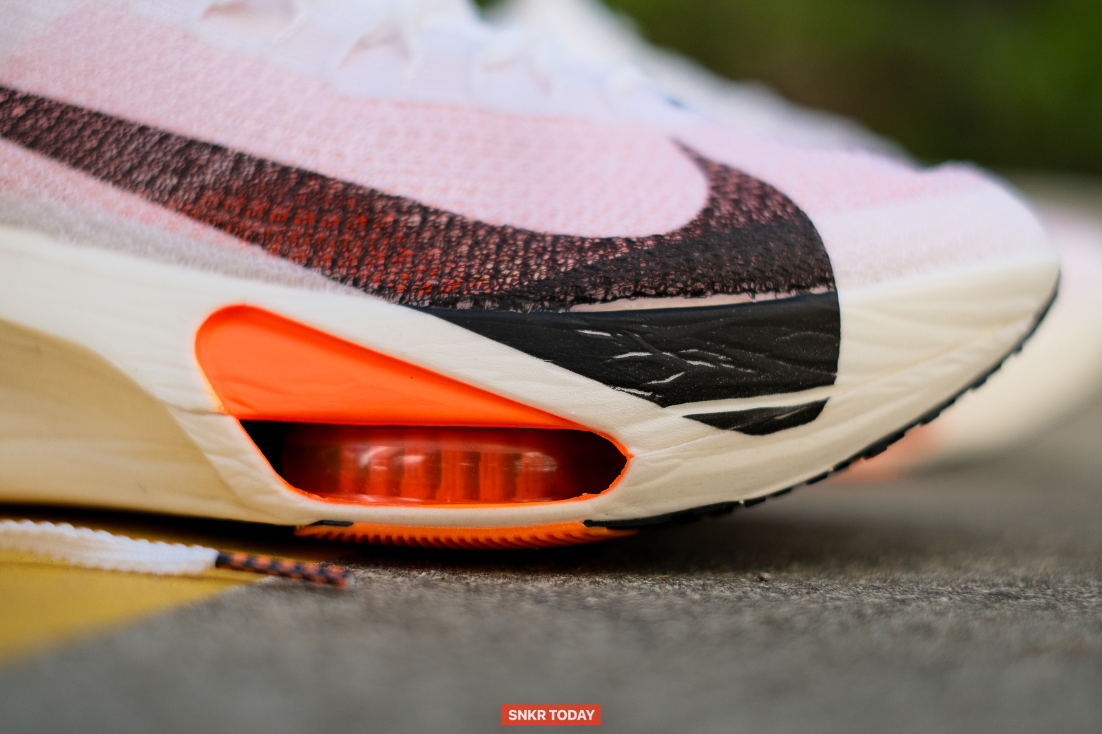 หากใครที่ผ่านการใช้งาน Alphafly NEXT% รุ่นแรก รวมถึง Alphafly NEXT% 2 มาแล้ว ต้องบอกเลยว่า Alphafly 3 นี้ ให้ความรู้สึกที่เป็นมิตรมากขึ้นแบบชัดเจนเลย เริ่มจากการปรับดีไซน์ของพื้นชั้นกลางซูเปอร์โฟม ZoomX ที่มีการเชื่อมต่อกันตั้งแต่ส้นเท้าไปจนถึงปลายเท้า ซึ่งการออกแบบแบบนี้ทำให้รองรับการลงเท้าได้หลากหลายรูปแบบและทำให้มีความสมูทมากขึ้น จากเดิมที่ต้องเน้นลงปลายเท้าอย่างเดียว ในรุ่นนี้ก็ตอบโจทย์สำหรับคนลงส้นเท้าหรือลงกลางเท้ามากขึ้น มีการปรับตำแหน่ง Zoom Air Pods คู่หน้าเท้าเล็กน้อย ทำให้ได้องศาการลงเท้าและเมื่อมีแรงกดผ่านแผ่นคาร์บอนที่อยู่ด้านในก็เสริมแรงกดลง Zoom Air Pods ได้อย่างเต็มที่ และมอบแรงส่งคืนที่ผลักเท้าในจังหวะตอนยกเท้าได้แบบชัดเจน ช่วยทำให้เราก้าวเท้าได้ยาวขึ้นและยกเท้าเร็วขึ้นด้วย