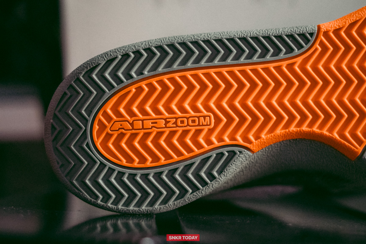 สำหรับด้านเพอร์ฟอร์แมนซ์ ใครที่เป็นสายจั๊มป์ชู้ตนี่เหมาะเลย Zoom Air หน้า 14 มม. ที่ส้นเท้า ช่วยเด้งได้เป็นอย่างดี ลงเต็มเท้าแล้วก็กระโดดนี่คือรู้สึกลอยตัวได้ชัดเจน ส่วนพื้นชั้นกลางโฟม Cushlon 2.0 ที่มีการทำลายก้างปลา Harringbone เอาไว้เพื่อความยืดหยุ่น ก็ให้ความนุ่มได้ดี และล้อมด้วย TPU Sidewall แบบยาวเพื่อช่วยล็อคเท้าให้อยู่บนฟุตเบด พื้นก้างปลา ยึดเกาะดี หนึบ อัปเปอร์ขึ้นอยู่กับวัสดุ ไม่ถึงกับล็อคดาวน์ดี แต่ก็ไม่แย่ ที่สำคัญคือ สวย