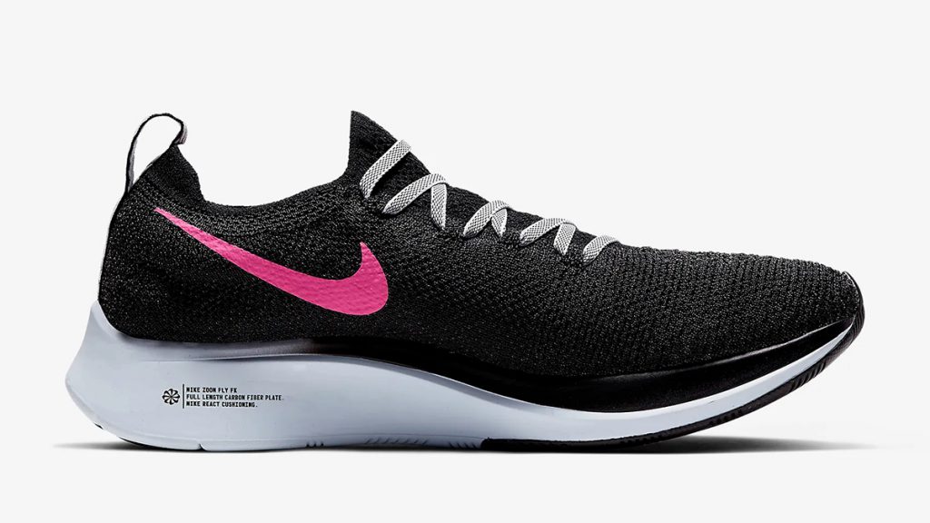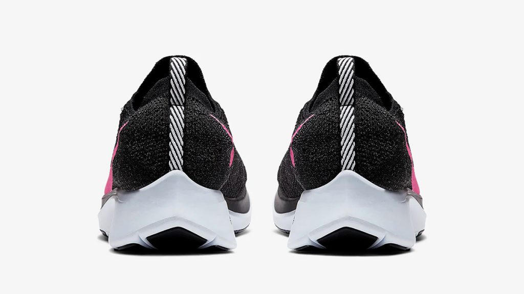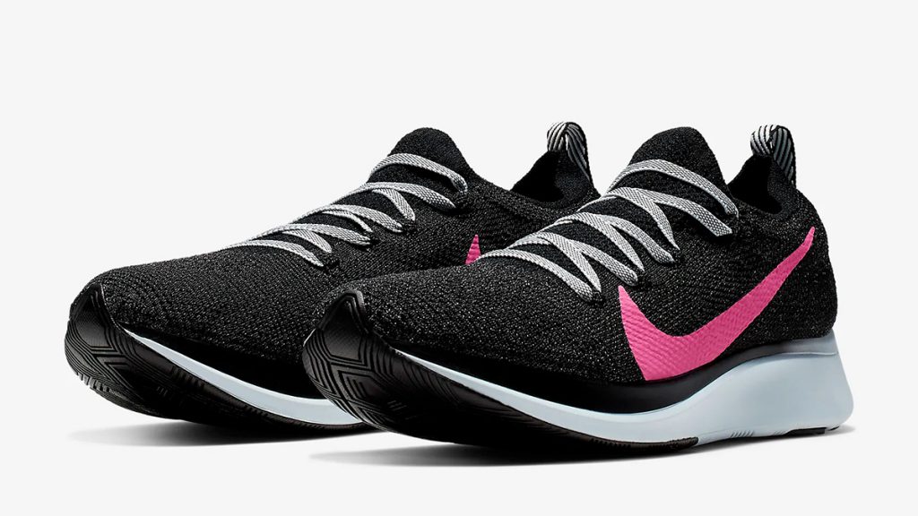 รองเท้าวิ่งสายสปีดที่มาพร้อมกับผ้าถัก Flyknit ที่มีความยึดหยุ่นและความกระชับสีดำตัดกับ Swoosh สีชมพูสดทำให้รองเท้าดูโดดเด่นขึ้นมาทันที เชือกสีขาวลายทางลายเหมือนกับตรงส้นของรองเท้า