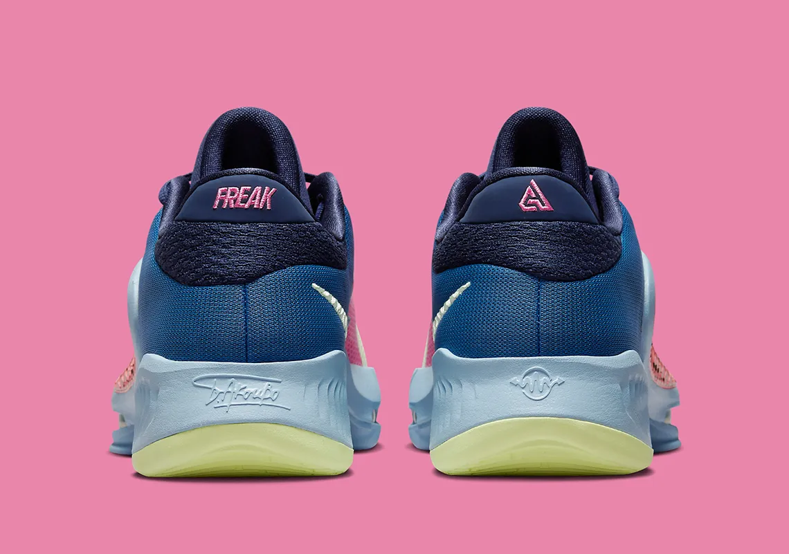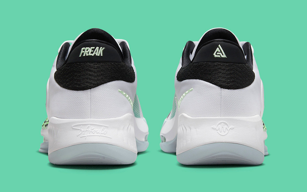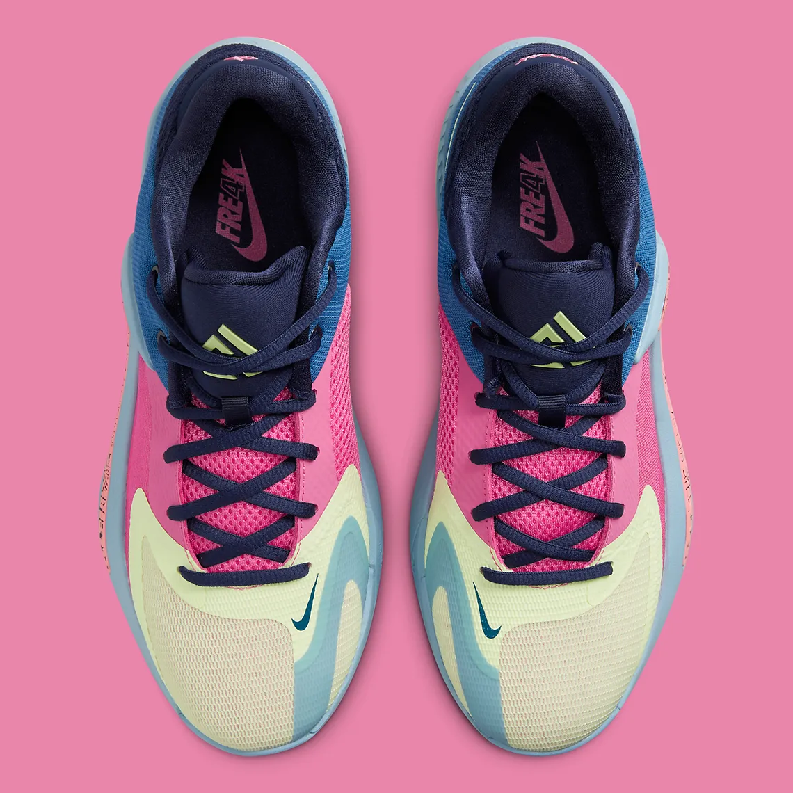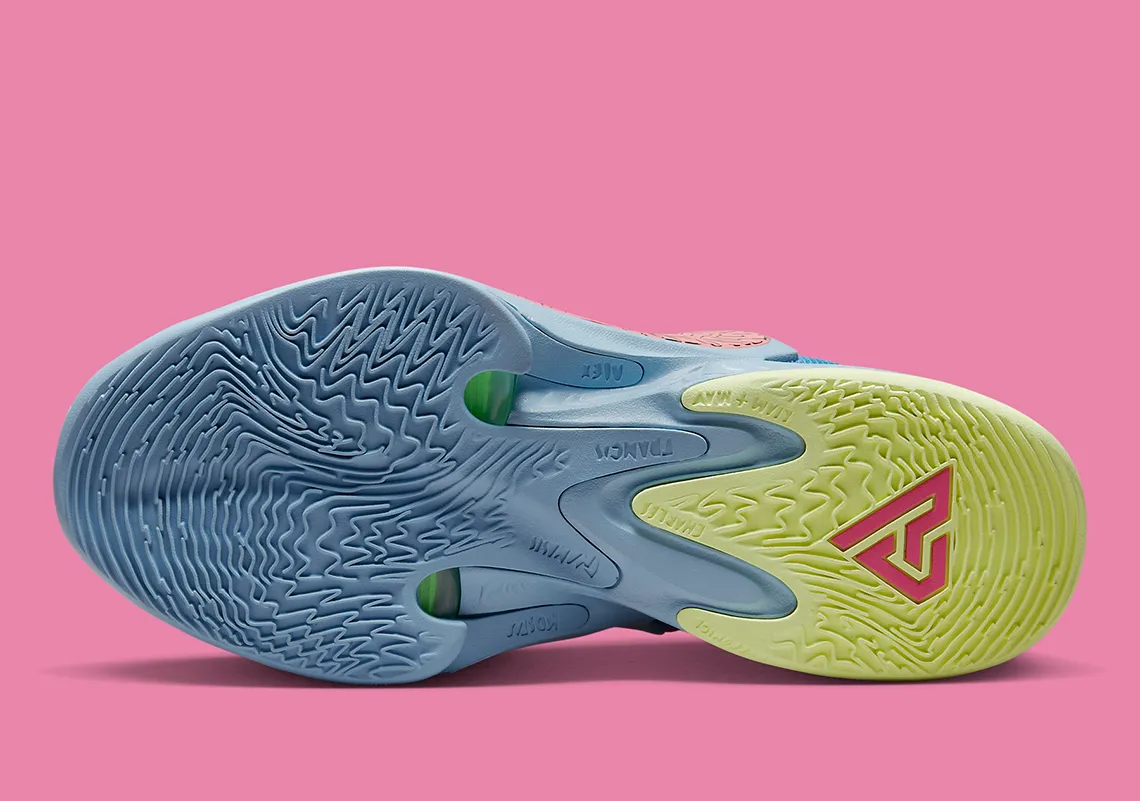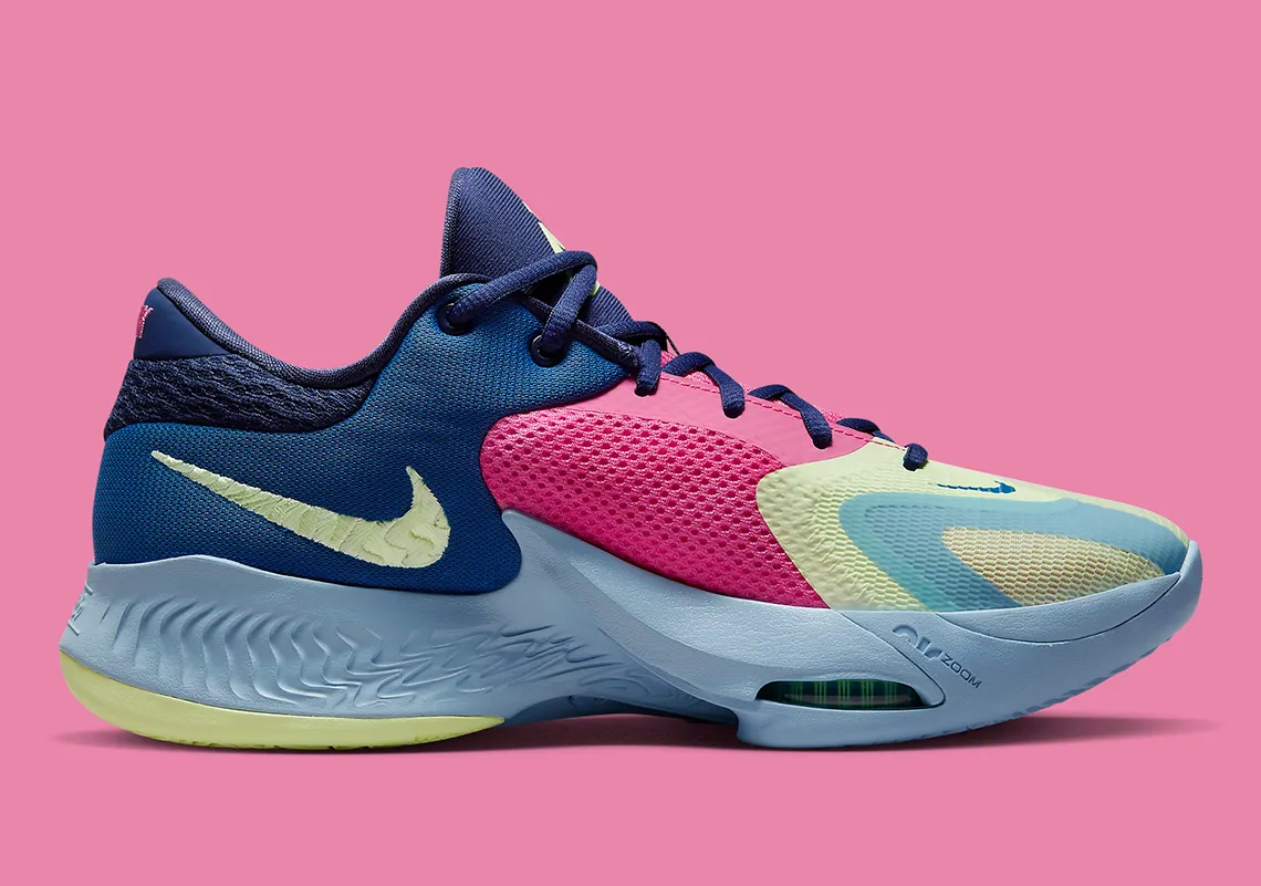 สำหรับ Zoom Freak 4 นั้นจะยังคงมีความคล้ายกับ Zoom Freak 3 งคงใช้ Zoom Air Pods คู่ด้านหน้าสำหรับการตอบสนองและการพุ่งตัวไปข้างหน้าเพื่อให้รองรับสไตล์ของยานนิส ส่วนพื้นชั้นกลางยังคงมาในดีไซน์ที่เว้าตรงกลางเท้า และยังเปิดโชว์ Zoom Air เพื่อเพิ่มพื้นที่สำหรับการขยายตัวทำให้การพุ่งตัวนั้นทำได้ดีกว่าเดิม และยังมีการปรับให้พื้นเอียงไปข้างหน้าเพื่อช่วยในเรื่องของการวิ่งด้วย และที่น่าสนใจก็คือมีการใส่โลโก้ของ Nike Zoom G.T. Run เข้ามาไว้ที่ส้นเท้าของรองเท้าบาสเกตบอลคู่นี้ด้วย น่าจะเป็นการเมคชัวร์ว่าคู่นี้เหมาะสำหรับผู้เล่นที่มีการวิ่งเยอะๆ ส่วนพื้นชั้นนอกก็มีการใช้ลวดลายที่จากคอมพิวเตอร์เพื่อช่วยให้มีการยึดเกาะได้หลายทิศทาง และยังมีการแบ่งโซนช่วงหน้าเท้าและตรงส้นเท้าอยู่