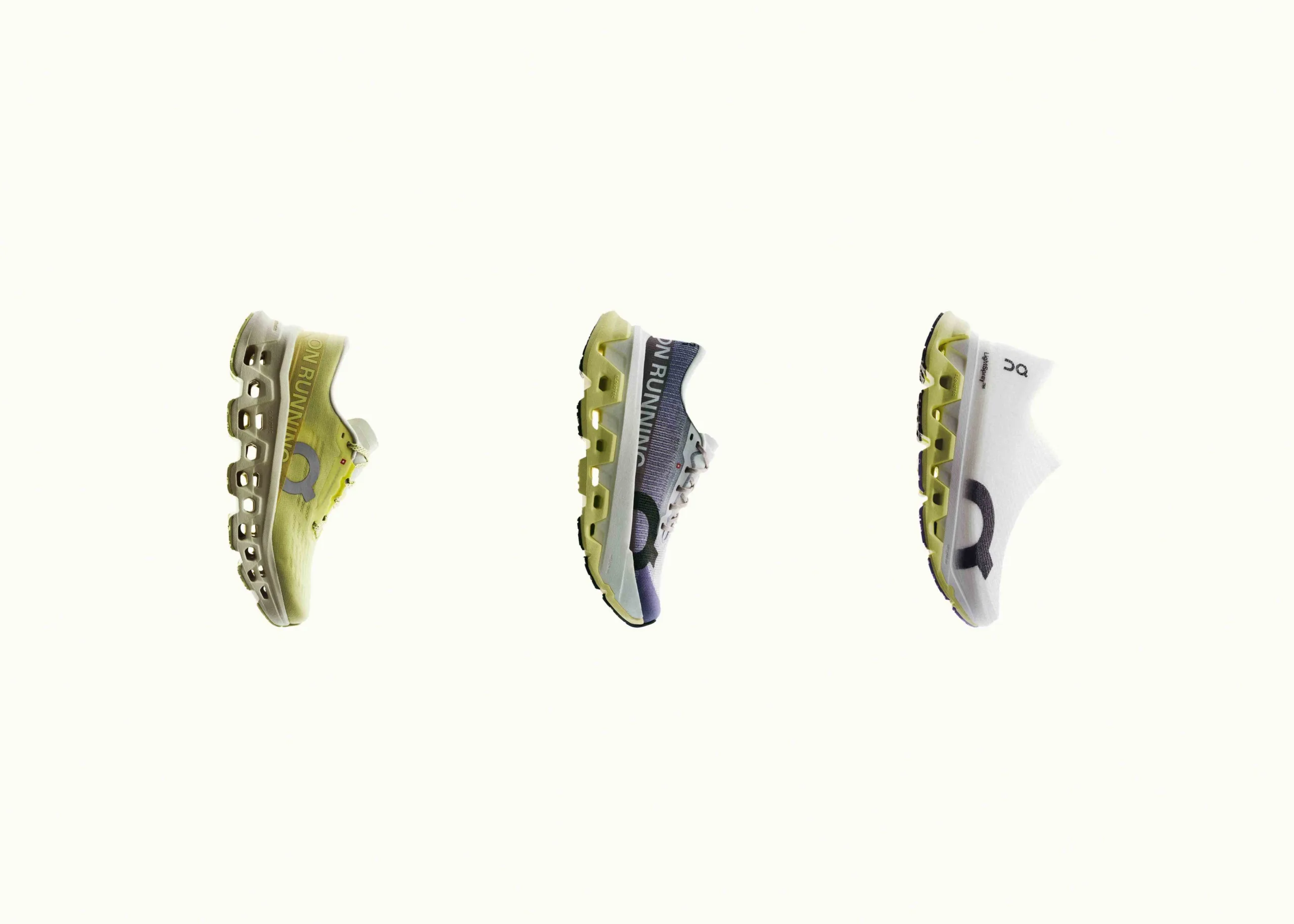 ออกแบบมาสำหรับนักวิ่งที่ต้องการวิ่งให้เร็วขึ้นและไกลขึ้น LightSpray Cloudmonster 3 Hyper ยกระดับ Cloudmonster รุ่นที่ตอบสนองดีที่สุดและซัพพอร์ตมากที่สุด ด้วยเทคโนโลยีอัปเปอร์ LightSpray™ อันล้ำสมัยของ On ด้วยการนำโครงสร้างอัปเปอร์น้ำหนักเบาพิเศษนี้มาใช้กับคอลเลกชันใหม่ ซึ่ง On สามารถสร้าง Cloudmonster ที่เบาที่สุดเท่าที่เคยมีมา โดยไม่ลดทอนความรู้สึกและประสิทธิภาพในการวิ่ง รองเท้ารุ่นนี้ผลิตจากชิ้นส่วนเพียง 8 ชิ้นเท่านั้น ได้แก่ อัปเปอร์ 1 ชิ้น, ส่วนพื้นชั้นกลาง 2 ชิ้น และชิ้นยางขนาดเล็ก 5 ชิ้น